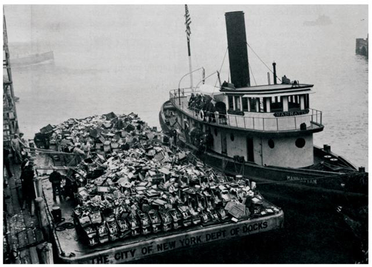 Aqui se puede apreciar una considerable cantidad de flipers y tragamonedas en una barcaza camino al fondo del rio Hudson .