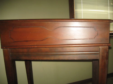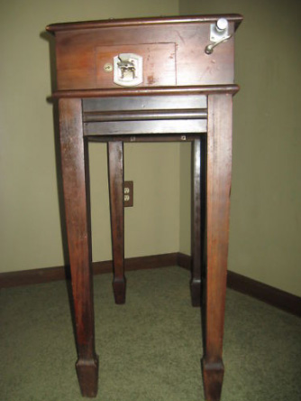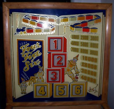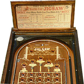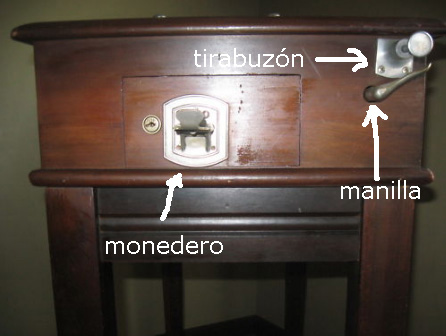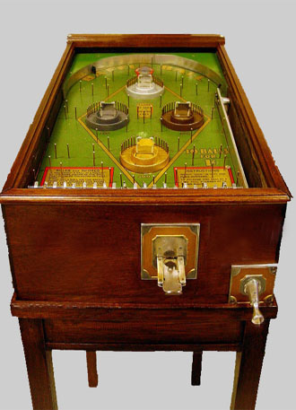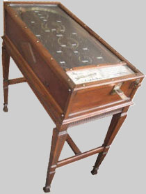 | En esta serie de imagenes podemos apreciar que estas máquinas eran completamente de madera, muy similares a cualquier mesita de arrimo y sin ningún detalle de pintura externa pero ya se puede apreciar un vidrio en la parte superior y al frente un monedero y el tirabuzón para tirar la bola. Vale la pena destacar que las bolas se ponian en juego manualmente gracias a una manilla o palanca situada cerca del tirabuzón. | |