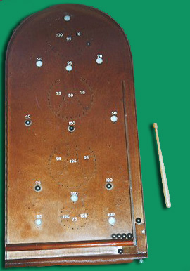<== Primitiva Bagatelle. Ya se aprecian significativos cambios, como el hecho de que las bolas que no caen en ningún hoyo se acumulan abajo y la bola se pone en juego desde un canal lateral. Sin embargo aun se utiliza el taco para servirla, lo cual sería reemplazado con un siguiente avance: el tirabuzón, o ball shotter. |