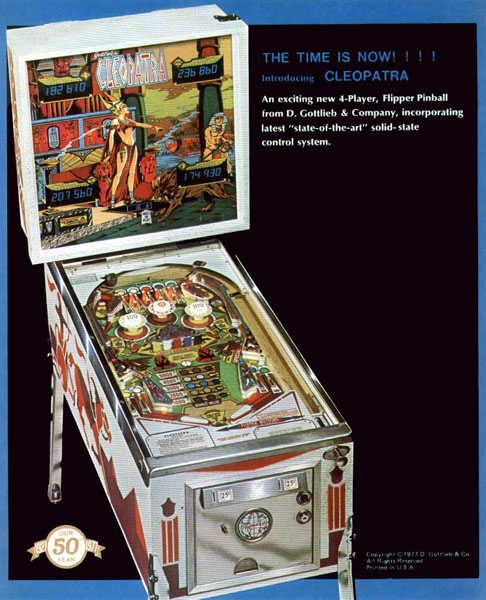 Cleopatra de Gottlieb. Otros títulos de esta época: Sinbad, Close Encounters of the Third Kind, Charlie's Angels, The Incredible Hulk, Solar Ride, Count Down, Pinball Pool, Totem, Genie, Roller Disco, Spiderman, Circus, Panthera, James Bond, Mars, Pink Panther, Volcano, Hole, Haunted House, Caveman, Rocky.