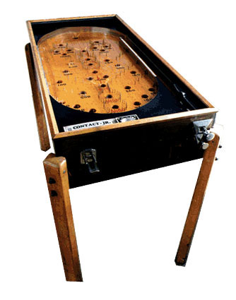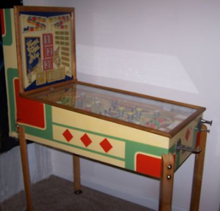 Siguiendo con la evolución de los flippers, algunos de estos gabinetes, que eran de sobremesa, fueron montados con sus propias patas de madera y también vemos vidrio encima de la tabla y un monedero al frente, acercándonos aun más al flipper actual.