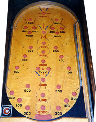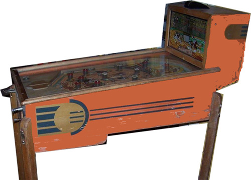| Alrededor de 1935 las mesas eran planas, pero pronto se comienzan a ver las primeras máquinas con "cabezal". Lo que a futuro sería el backbox. En este punto solo se trataba de una pieza de madera con un afiche informativo sobre el precio o instrucciones para jugar. A futuro el backbox contendrá todos los circuitos de control de la máquina.