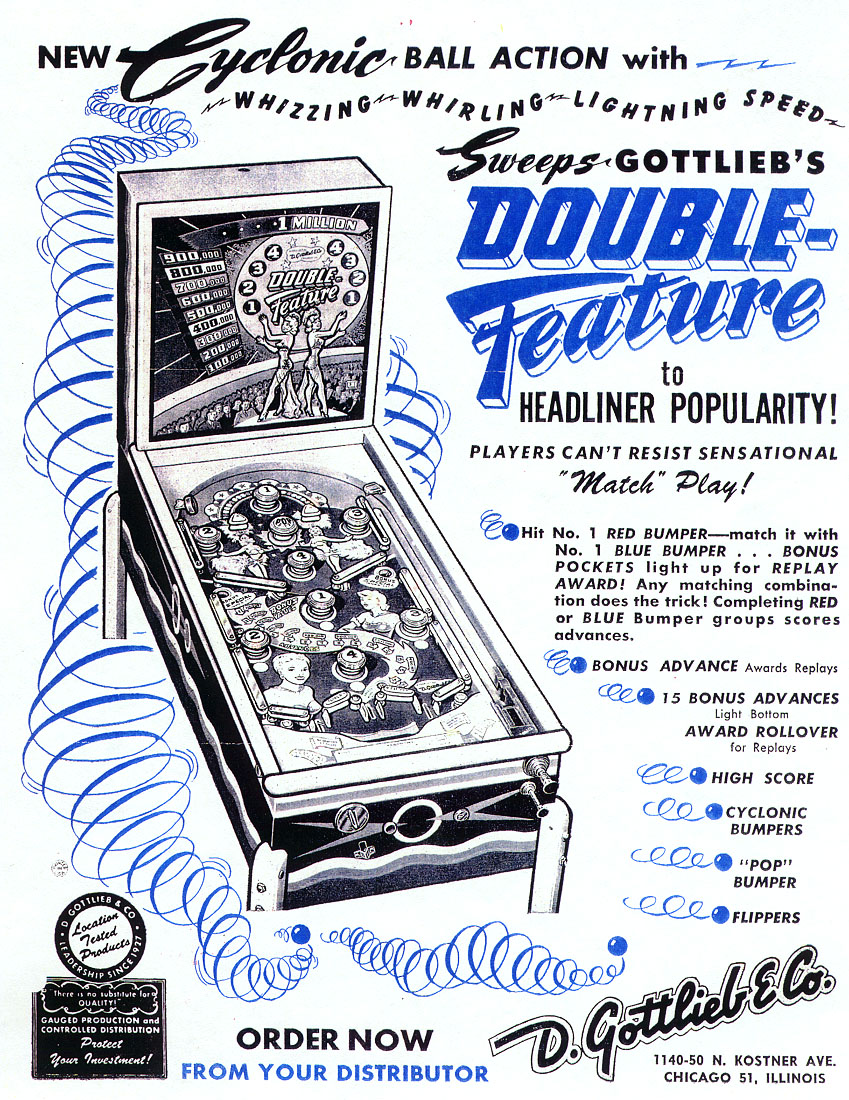 Double Feature fabricado por Gottlieb en 1950, primero en tener elásticos (slingshots).