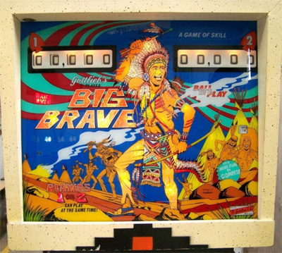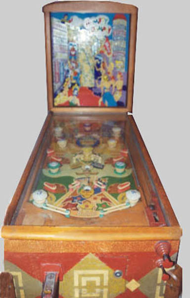 En esta máquina "Hot Springs" de 1937 podemos ver otro paso más en la evolución del flipper. El cabezal ya tiene un tamaño similar al que conocemos y además en él podemos ver un diseño relativo al juego pintado en un panel de acrílico. Además ahora los puntos no solo se pueden ver en forma visual en el tablero, en el cabezal hay una serie de ampolletas que iluminan valores pintados en el acrílico e indican cuanto puntaje se a logrado. | |