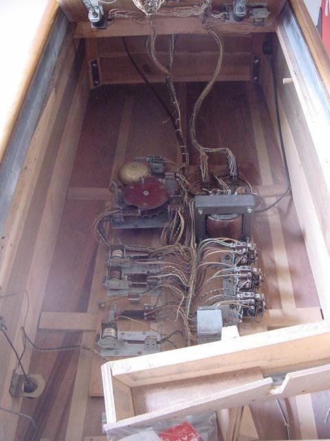 En la imagen se puede apreciar un banco sacado de su posición para poder apreciarlo mejor. Los plásticos amarillos que se ven son la terminación de cada palanca y son los que presionan o liberan los platinos de cobre para lograr una correcta secuencia.