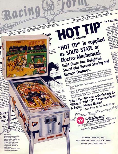 El Hot Tip era controlado por una micro-computadora y tarjetas electrónicas, pero en Williams querían ser cautos con la introducción de esta nueva tecnología y por eso los sonidos continuaron usando el sistema de campanitas electromecánicas, al igual que un reel para general el sonido de la puntuación. Todo para que el jugador no sintiera un cambio tan brusco de la noche a la mañana. Otros títulos de esta época: Disco Fever, Phoenix, Flash, Stellar Wars, Tri Zone, Time Warp, Gorgar,