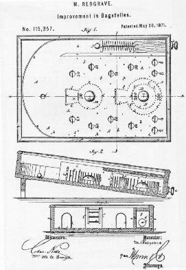 | Un 30 de Mayo de 1871 Montague Redgrave registra la patente #115,357 por su "mejora a la Bagatelle", la cual fue el "ball shotter" (lanzador de bola). Aunque esto no era un verdadero invento ya que existen dudas respecto a que Redgrave fuera el primero en crear este sistema. A pesar de esto se le reconoce como la primera patente relacionada con flippers. Y tal es su importancia que aun se sigue usando.
