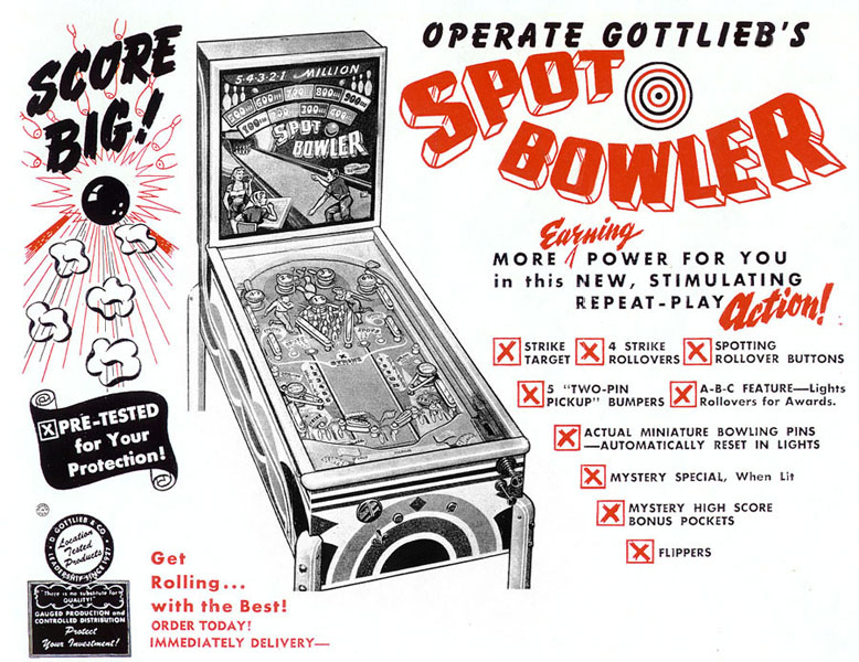 Spot Bowler  fabricado por Gottlieb en 1950, primero con las paletas en la posición estándar.