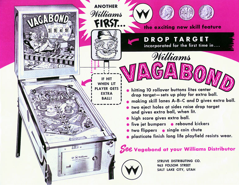Vagabond fabricado por Williams de 1962, primero con cartas que caen al golpearlas (drop targets).