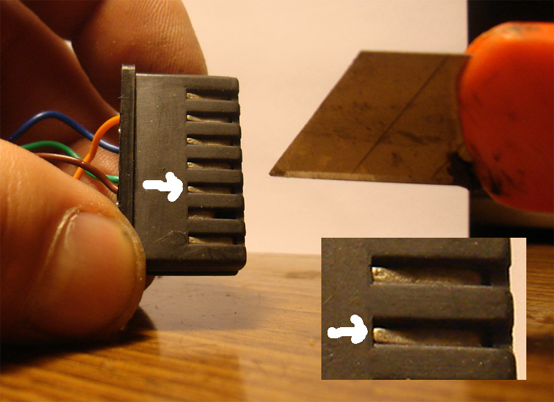 Usando una herramienta apropiada, en este caso un corta cartón, debemos hacer presión hacia abajo en las trabas de cada patita, teniendo cuidado de no hacer tanta que la quebremos o que pierda su tensión normal. En algunos casos es necesario tirar suavemente el cable de cada patita para que salga toda la pieza.