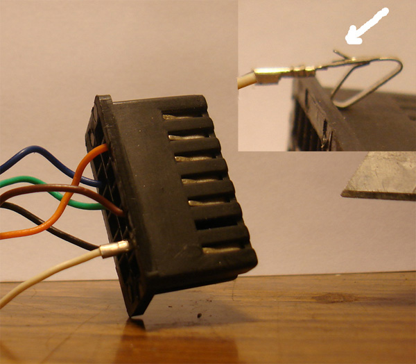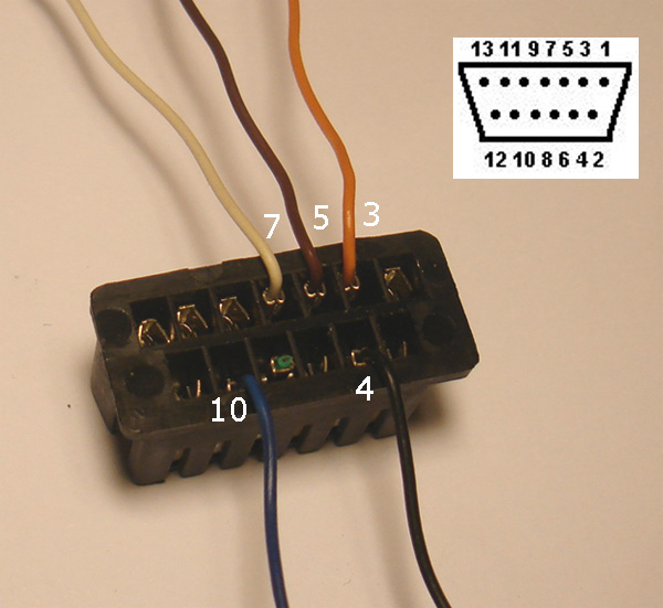 Ahora necesitamos el enchufe SIO. Reiteremos, en Chile tenemos abundancia de caseteras en ferias, persas, o incluso la de nuestra infancia, ya en desuso y de ellas podemos sacarlo. Si no la otra opción es cortar en dos un cable de disketera. Simplemente corten el cable dejando unos 10 cms de holgura, abran las tapas (todos tienen un perno muy facil de desatornillar) y vean que el orden de los cables sea como el requerido en la imagen o bién con un destornillador chico pueden hacerle presión a las patas para cambiarlos de posición y obtener el orden requerido: 3 Naranja, 4 negro, 5 café, 7 blanco, 10 azul. Los colores pueden variar pero lo importante es el orden de las conexiones. Es decir que el cable que sale de aquí debe llegar a alla, sin importar el color. Si no entiendes, registrate en el foro y pregunta. ¡Somos amables y ayudamos a quien lo requiera con amistad!. ;)