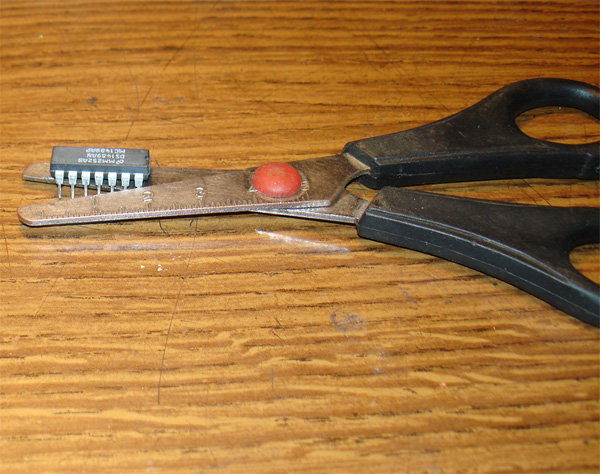 Lo primero a realizar es una acción que suena un poco "cavernícola", pero hay que hacerla: se deben cortar todas las patas del chip. De otra manera sería imposible poner el chip adentro del conector.