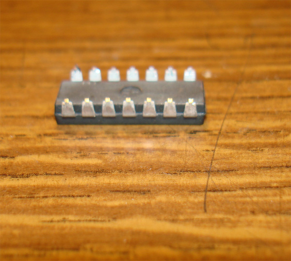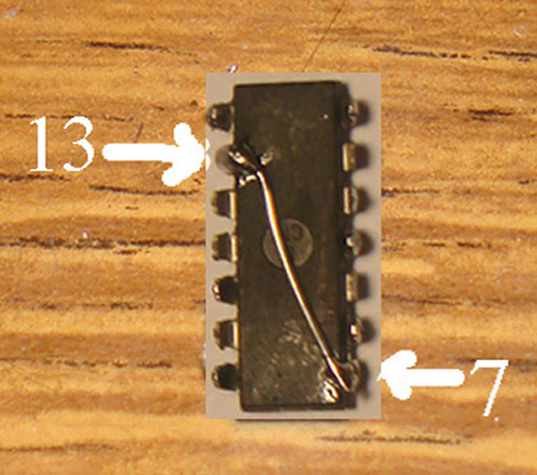 Ahora por abajo del chip soldaremos un cable que una las patas 7 y 13 del chip. Recordemos que el pin 7 es GND y lel pin 13 también requiere GND también, por eso se deben unir.